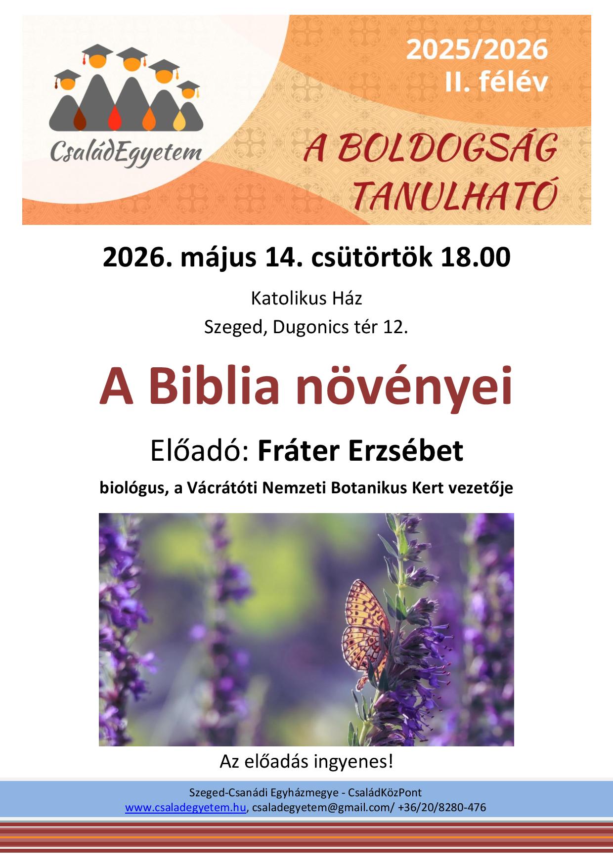 Szeretettel várjuka CsaládEgyetem májusi előadására, melynek címe: A Biblia növényei